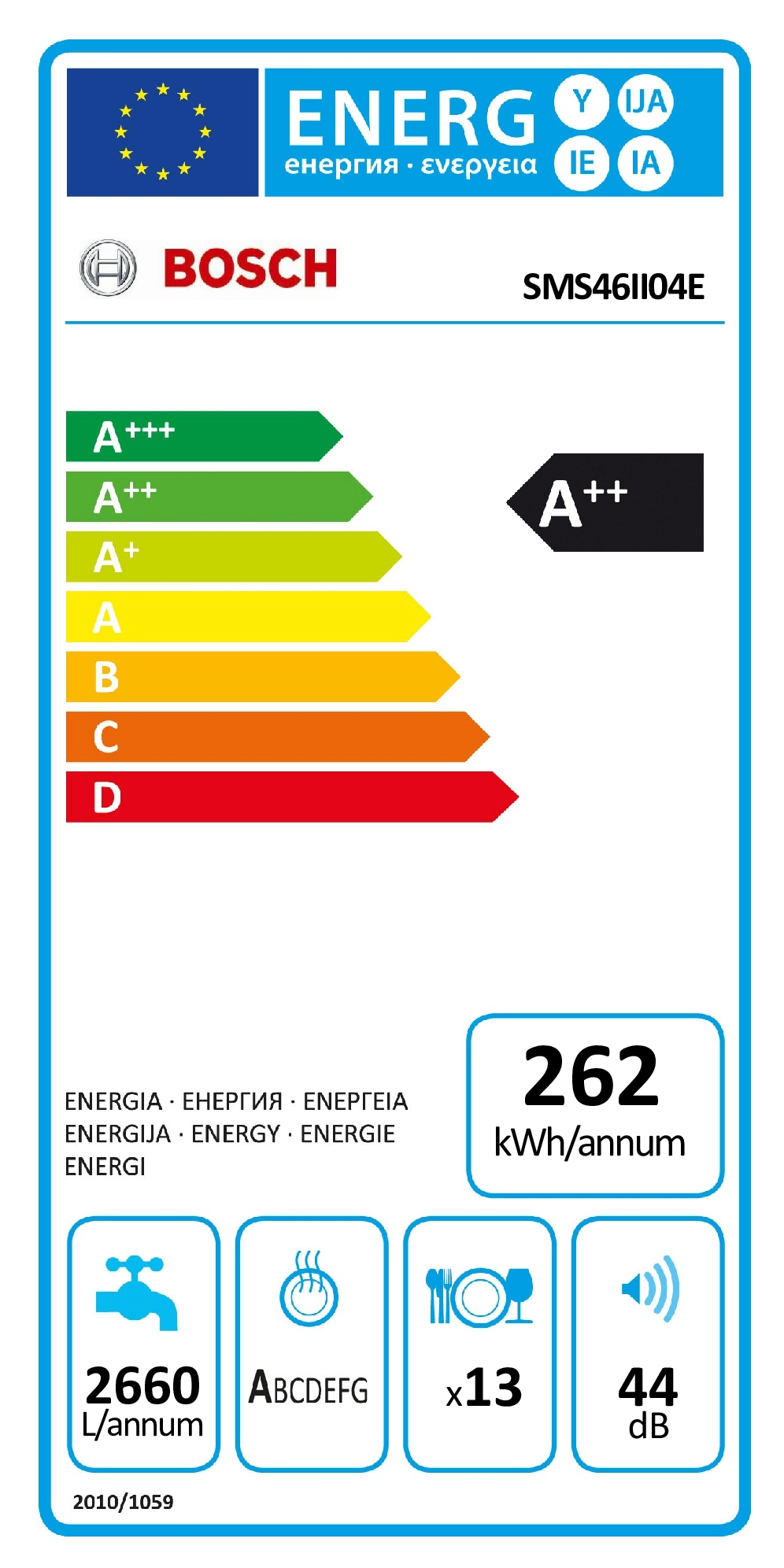 Consumo de electricidad en el programa: Eco 50 ° C: 262 kWh por año, basado en 280 ciclos estándar que utiliza agua fría y modo de baja potencia. El consumo real depende de cómo se usa el dispositivo.
