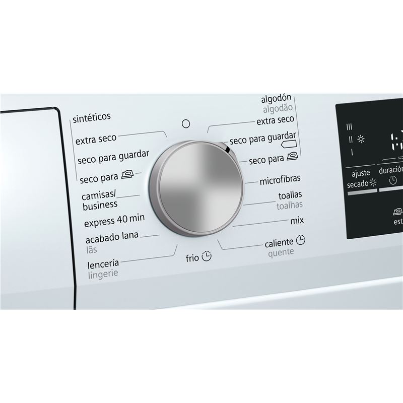 - Programas adicionales de secado: Acabado lana, Camisas/Blusas, Lencería, Mix, outdoor, Rápido 40 min, Temporizado caliente, Temporizado frío, Toallas