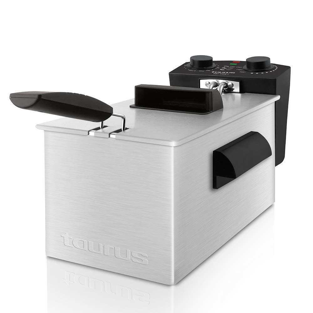 Freidora potente de 3 litros con resistencia sumergida y 2100W de potencia. Diseñada en acero inoxidable. Incluye regulador de temperatura con indicador luminoso y temporizador 30 minutos.