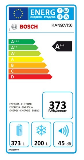 Bosch KAN90VI30. Dise¤o: Independiente, Color del producto: Acero inoxidable, Dise¤o: Puerta americana. Capacidad neta total: 573L, Clase clim tica: SN, T, Nivel de ruido: 45 Db. Frigor¡fico, capacidad neta: 373L. Congelador, capacidad neta: 195L, Posici¢n congelada: Lado, Capacidad de congelaci¢n: 12 kg/24h. Clase de eficiencia de energ¡a: A+, Carga conectada: 174W, Consumo de energ¡a anual: 373 kWh