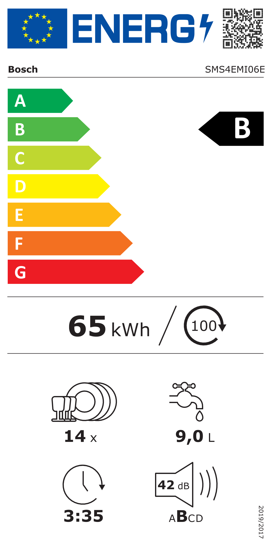 Consumo de energía por 100 ciclos programa ECO5: 65 kWh