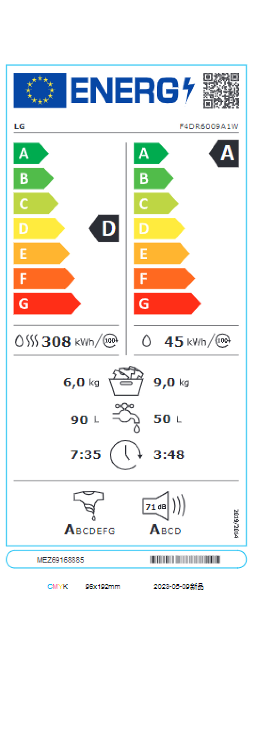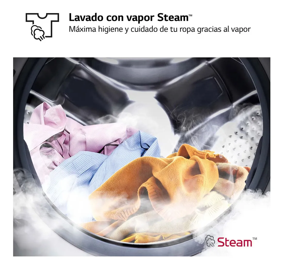 LG F4DR6009AGM. Tipo de carga: Carga frontal, Tipo de instalación: Independiente, Color del producto: Negro. Capacidad de nominal (lavado y secado): 6 kg, Máxima velocidad de centrifugado: 1360 RPM, Clase de secado por giro: A. Clase de eficiencia energética (lavado): A, Clase de eficiencia energética (lavado y secado): D, consumo de agua de lavado: 50 L. Tecnologías LG (cuidado de la ropa): 6 Motion DD, AI DD™, Steam™, TurboWash™, TurboWash™360. Profundidad: 565 mm, Ancho: 600 mm, Altura: 850 mm