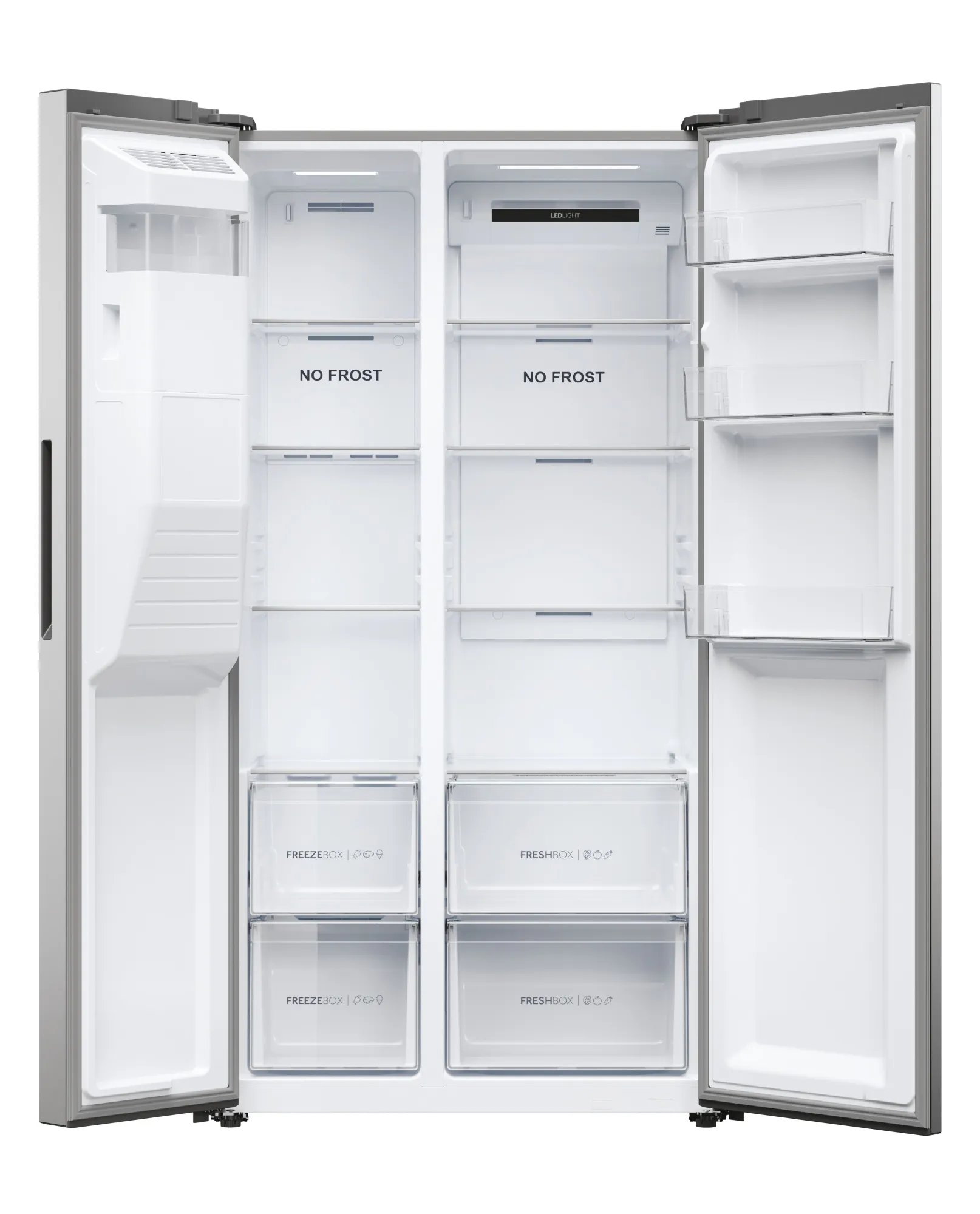 Haier SBS 90 Serie 5 HSR5918DIMP. Tipo de instalación: Independiente, Diseño de producto: Puerta americana, Color del producto: Platino, Acero inoxidable. Capacidad neta total: 511 L, Clase climática: ST, Clase de emisión de ruido: C. Frigorífico, capacidad neta: 333 L, Tipo de lámpara: LED. Congelador, capacidad neta: 178 L, Posición congelada: Lateral, Capacidad de congelación: 10 kg/24h. Clase de eficiencia de energía: D, Consumo de energía anual: 253 kWh, Escala de eficiencia energética: De la A a la G