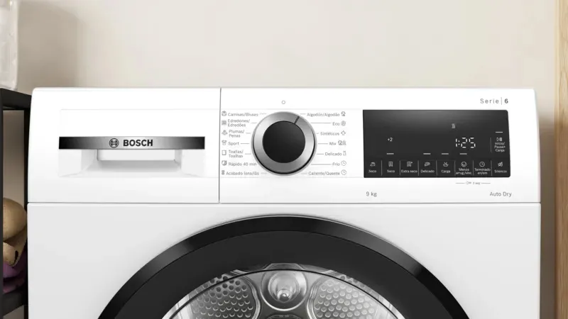 Bosch Avantixx 6 WQG24200ES. Tipo de instalación: Independiente, Tipo de carga: Carga frontal, Sistema de secado: Bomba de calor. Capacidad nominal: 9 kg, Clase de eficiencia de condensación: C, Programas de secado: Ropa de cama, Blusa / camisa, Algodón, Delicado/seda, Lavado y secado rápido, Mix, Rápido,.... Ajuste de patas: 1,5 cm. Clase de eficiencia de energía: D, Consumo de energía por 100 ciclos: 128 kWh, Consumo de energía: 1,28 kWh. Tecnologías Bosch (cuidado de la ropa): Diseño antivibraciones, AutoDry