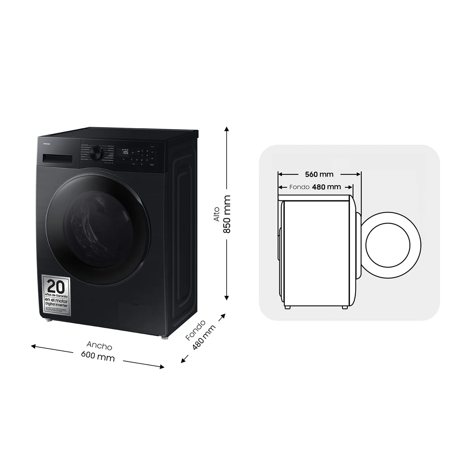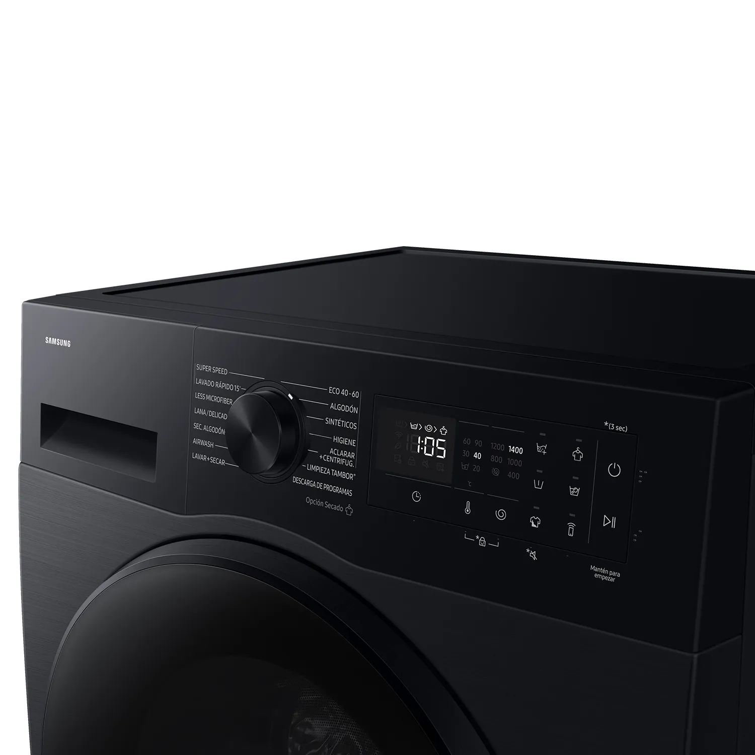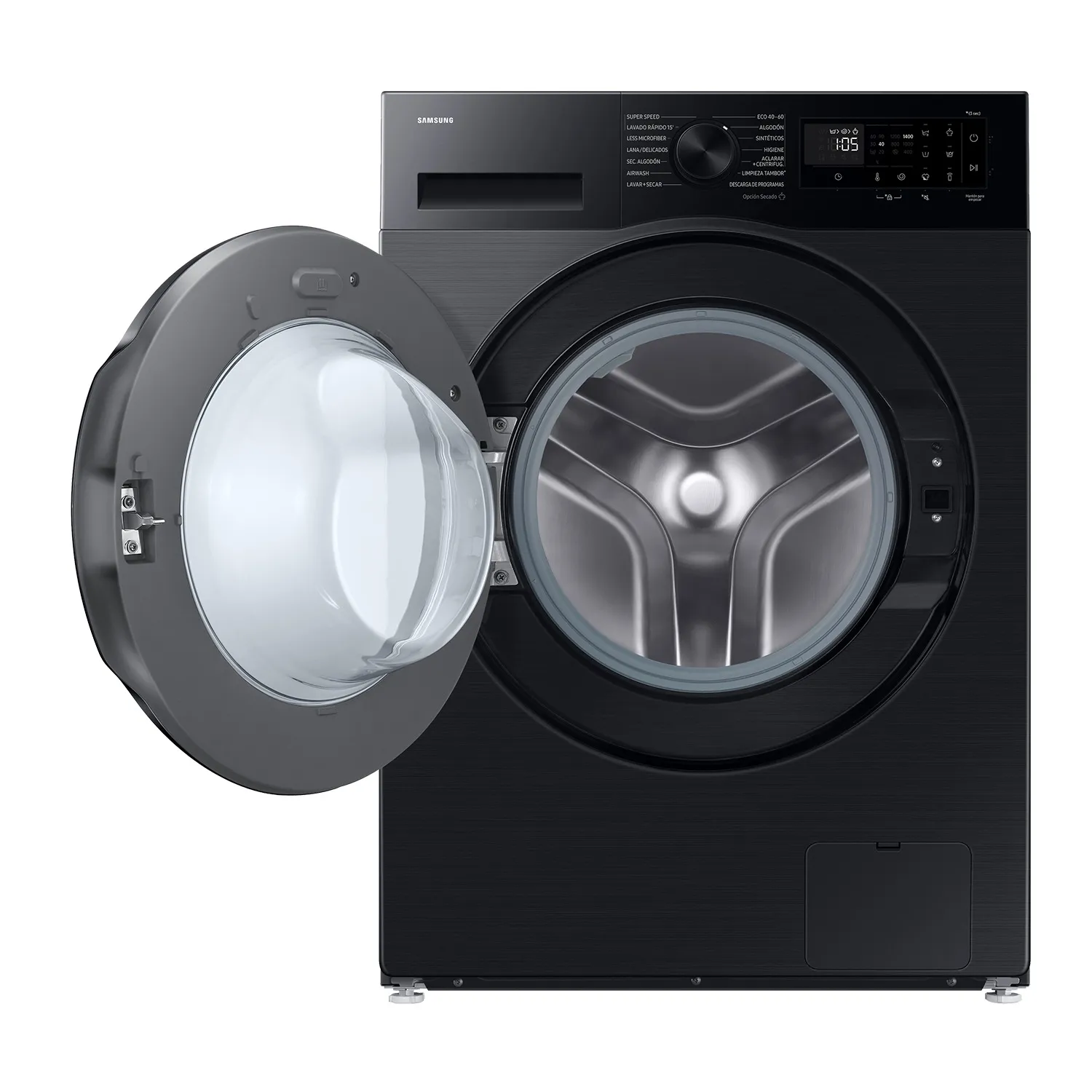 Samsung Lavasecadora con fondo reducido 9kg/5kg AI Ecobubble™ Clase E/A-10% Negra WD90DG5G34BBEC. Tipo de carga: Carga frontal, Tipo de instalación: Independiente, Color del producto: Negro. Capacidad de nominal (lavado y secado): 5 kg, Máxima velocidad de centrifugado: 1400 RPM, Clase de secado por giro: B. Clase de eficiencia energética (lavado): A, Clase de eficiencia energética (lavado y secado): E, consumo de agua de lavado: 50 L. Tecnologías Samsung (cuidado de la ropa): BubbleSoak™, Drum Clean+, SmartThings. Profundidad: 480 mm, Ancho: 600 mm, Altura: 850 mm