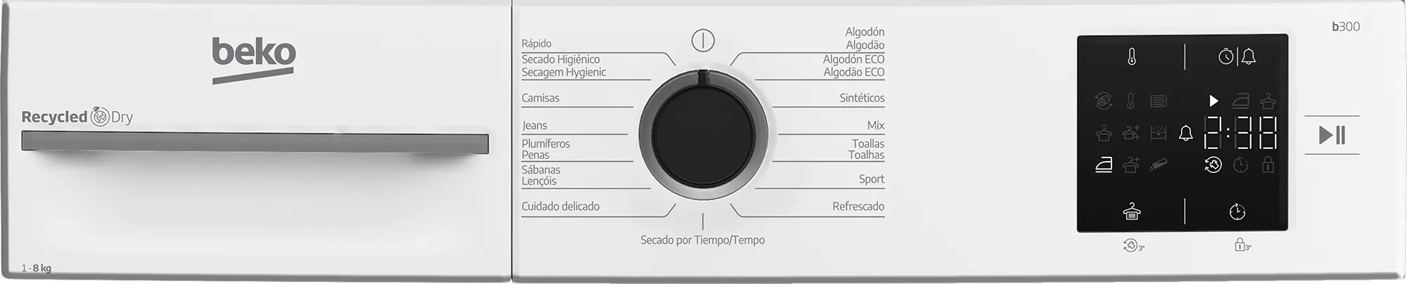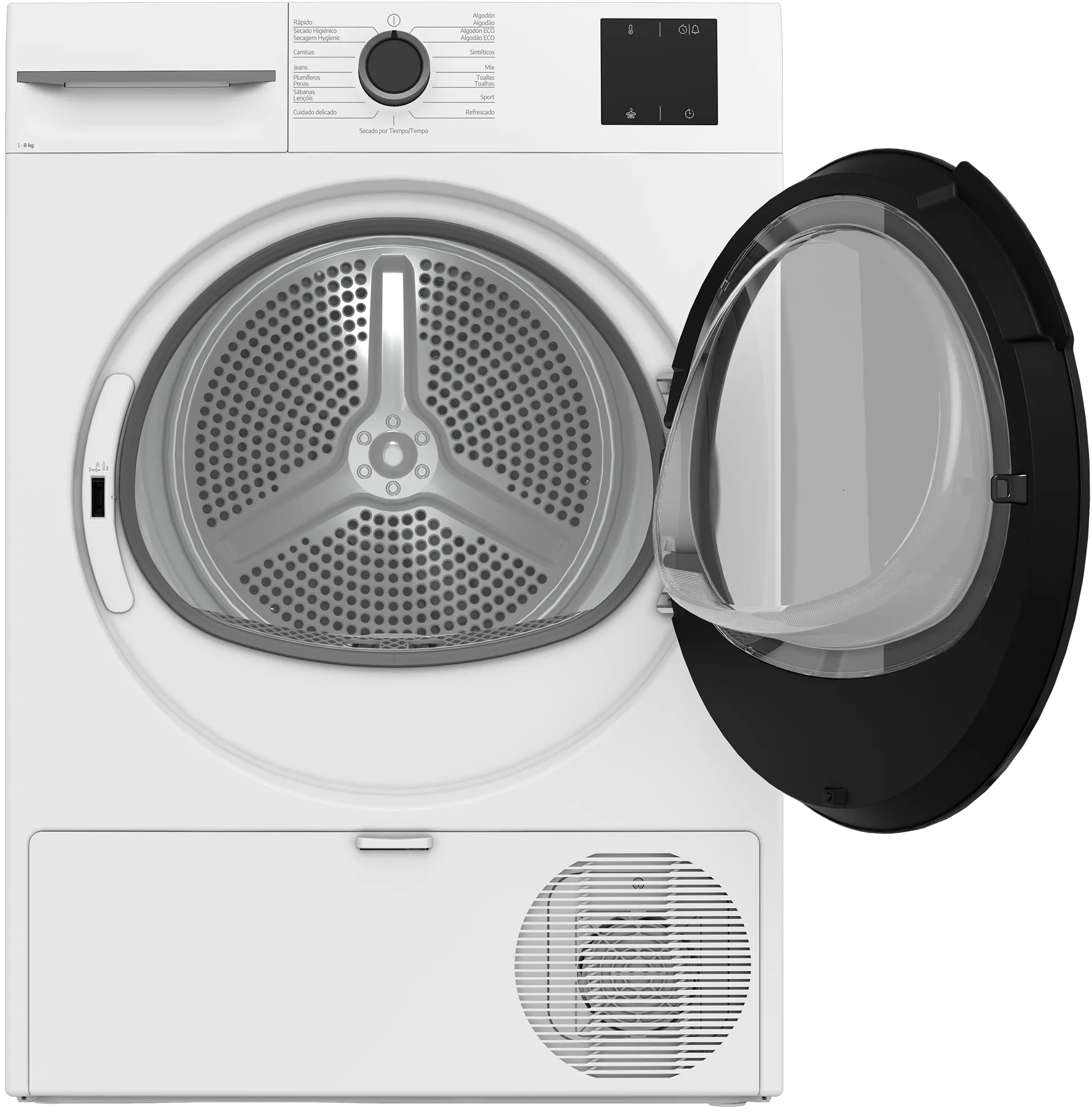Beko BM3T39220WB. Tipo de instalación: Independiente, Tipo de carga: Carga frontal, Sistema de secado: Bomba de calor. Capacidad nominal: 8 kg, Clase de eficiencia de condensación: B, Programas de secado: Algodón, Cotton eco, Ropa de abrigo/Edredón de plumas, Drying rack/TimeDry, Cuidado delicado,.... Clase de eficiencia de energía: D, Consumo de energía por 100 ciclos: 119 kWh, Consumo de energía anual: 220,2 kWh. Tecnologías Beko (cuidado de la ropa): Aquawave. Profundidad: 545 mm, Ancho: 598 mm, Altura: 846 mm