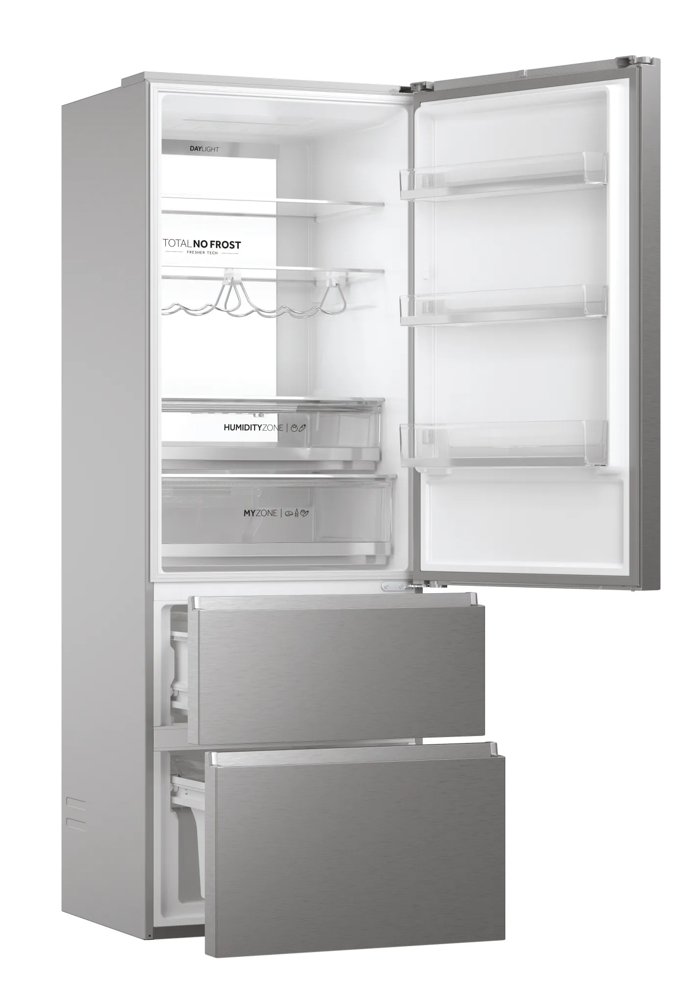 Haier 3D 70 Serie 7 HTW7720BNMM. Capacidad neta total: 486 L. Bisagra para puerta: Derecho. Clase climática: SN-T, Nivel de ruido: 36 dB. Frigorífico, capacidad neta: 344 L, Antiescarcha (nevera), Sistema multi-flujo de aire (nevera), Luz interior de la nevera. Congelador, capacidad neta: 142 L, Capacidad de congelación: 10 kg/24h, Antiescarcha (congelador). Compartimiento de zona fresca. Clase de eficiencia de energía: B, Consumo de energía anual: 243 kWh. Color del producto: Plata
