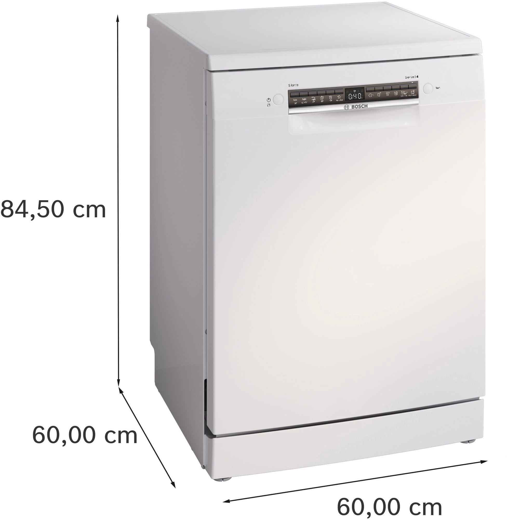Bosch Serie 4 SMS4HTW16E. Tipo de instalación: Independiente, Talla del producto: Tamaño completo (60 cm), Color de la puerta: Blanco. Número de cubiertos: 13 cubiertos, Clase de emisión de ruido: C, Nivel de ruido: 46 dB. Ajuste de patas: 2 cm, Aplicaciones de control compatibles: Bosch Home Connect, Funciones de aplicaciones: Remote diagnostics, Supervisión remota, Inicio remoto. Clase de eficiencia de energía: C, Consumo de agua por ciclo de lavado: 9 L, Consumo de energía por 100 ciclos: 74 kWh. Ancho: 600 mm, Profundidad: 600 mm, Altura: 845 mm