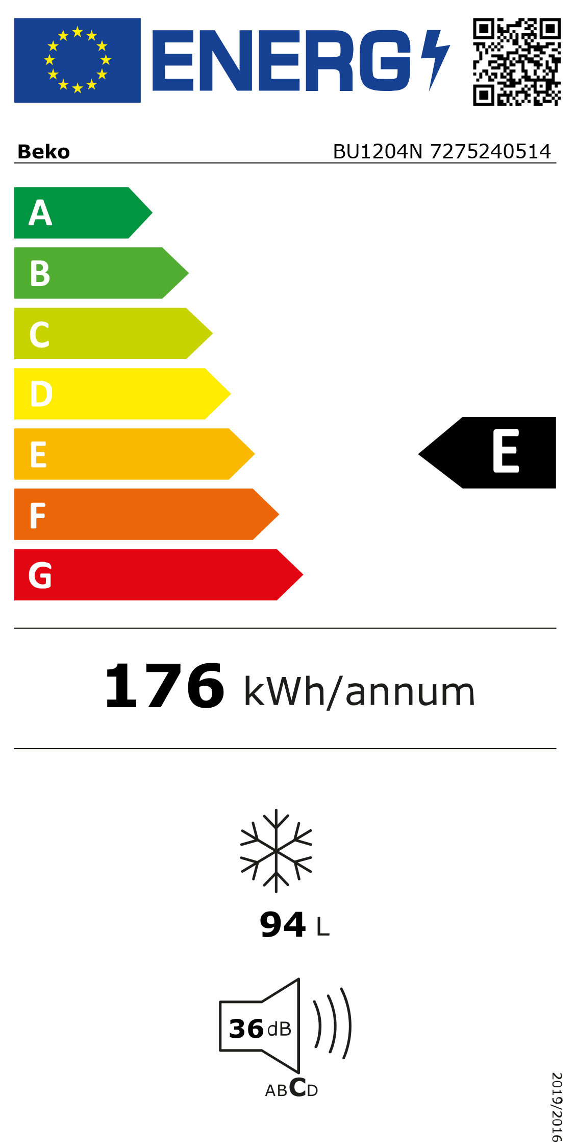 Beko BU1204N. Congelador, capacidad neta: 94 L, Clase climática: SN-T, Capacidad de congelación: 4,9 kg/24h, Tiempo de almacenamiento en caso de fallo de alimentación: 19 h, Nivel de ruido: 36 dB, Índice Star: 4*. Bisagra para puerta: Derecho. Clase de eficiencia de energía: E, Consumo de energía anual: 176 kWh. Color del producto: Blanco