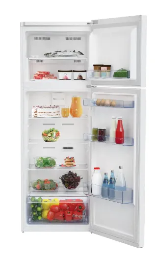 Beko RDNE350K40WN. Capacidad neta total: 313 L. Bisagra para puerta: Derecho. Clase climática: SN-T, Nivel de ruido: 38 dB. Frigorífico, capacidad neta: 240 L, Luz interior de la nevera, Frigorífico, número de compartimentos: 4, Número de compartimientos para verduras: 1. Congelador, capacidad neta: 73 L, Capacidad de congelación: 8 kg/24h. Clase de eficiencia de energía: E, Consumo de energía anual: 220 kWh. Color del producto: Blanco
