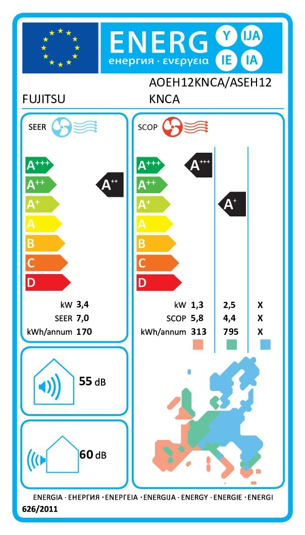 Fujitsu ASY 35 KN WIFI. Tipo: Sistema split, Color del producto: Blanco, Funciones de aire acondicionado: Enfriamiento, Calentar, Ventilador, Deshumedecer. Clase de eficiencia energética (refrigeración): A++, Clase de eficiencia energética (calefacción) (temporada de calefacción media): A+, Consumo anual de energía (enfriamiento): 170 kWh. Nivel de potencia acústica de la unidad interior: 49 dB, Tipo de unidad interna: Montar en la pared, Nivel de ruido de la unidad interior (a baja velocidad): 20 dB. Nivel de potencia acústica de la unidad exterior: 61 dB, Enfriamiento del flujo de aire (unidad exterior): 1460 m³/h, Calefacción flujo de aire (unidad exterior): 1360 m³/h