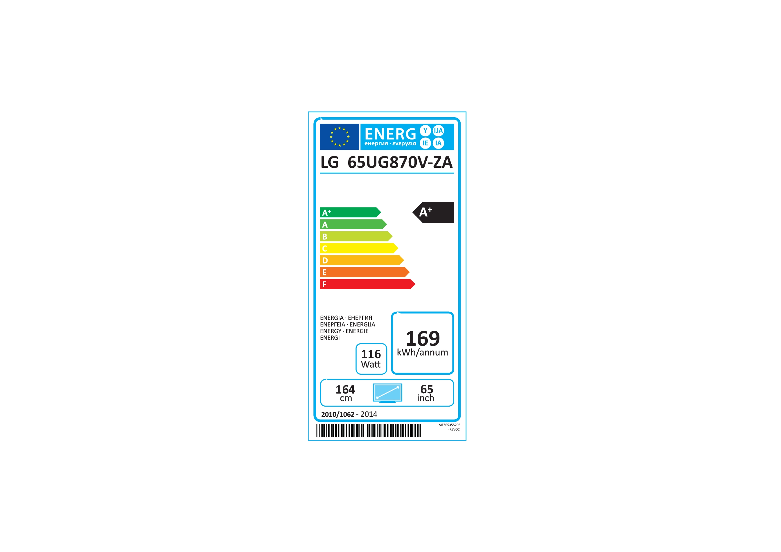 LG 65UG870V. Diagonal de la pantalla: 165,1 cm (65"), Tipo HD: 4K Ultra HD, Resolución de la pantalla: 3840 x 2160 Pixeles. Formato de señal digital: DVB-C, DVB-CI+, DVB-S2, DVB-T2. Teletexto: 2000 páginas. Color del producto: Negro. Consumo de energía (inactivo): 0,3W, Consumo energético: 116W, Consumo de energía anual: 169 kWh
