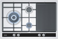 Siemens EC845XB90E. Dise¤o: Independiente, Color del producto: Acero inoxidable, Tipo de control: Giratorio. Hob type: Gas, Quemador a fuego lento/zona de cocci¢n: 1000 W, Quemador regular / zona de cocci¢n: 1700 W. Voltaje de entrada: 220 - 240 V, Potencia: 9200 W. Ancho: 762 mm, Profundidad: 520 mm, Altura: 52 mm