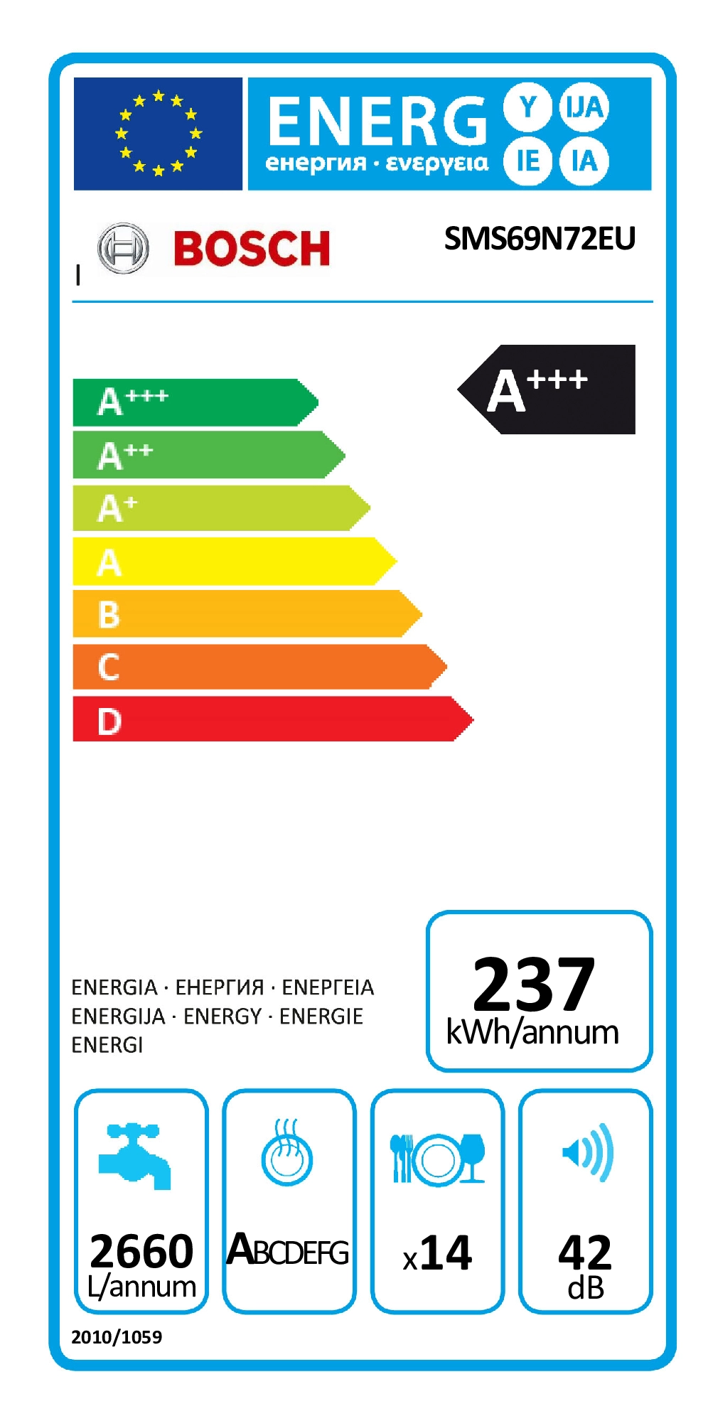 Bosch SMS69N72EU. Tipo: Independiente, Color del producto: Color blanco, Tipo de control: Botones. Nivel de ruido: 42 Db, Clase de secado: A, Tiempo de ciclo: 195 min. Ajuste de patas: 2 cm. Clase de eficiencia de energ¡a: A+++, Consumo de energ¡a por ciclo: 0,83 kWh, Consumo de agua por ciclo de lavado: 9,5L. Ancho: 60 cm, Profundidad: 60 cm, Altura: 84,5 cm