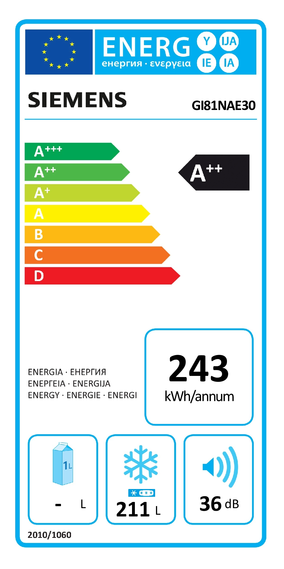 Siemens GI81NAE30. Dise¤o: Independiente, Tipo: Vertical, Bisagra para puerta: Izquierda/derecha. Congelador, capacidad neta: 235 L, Congelador, capacidad bruta: 211 L, Capacidad de congelaci¢n: 20 kg/24h. Longitud del cable: 230 m. Clase de eficiencia de energ¡a: A++, Carga conectada: 120 W, Consumo de energ¡a anual: 243 kWh. Ancho: 55,8 cm, Profundidad: 54,5 cm, Altura: 177,2 cm