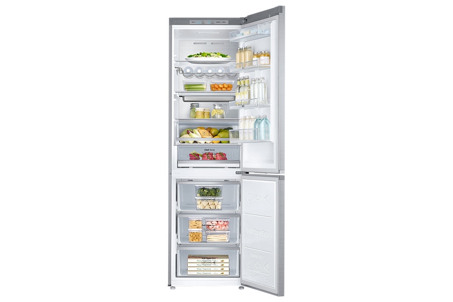 Los cocineros profesionales aseguran que un control preciso y estable de la temperatura es la clave para mantener los alimentos frescos por más tiempo. Con el Modo Chef tu comida no sufrirá variaciones de temperatura, por lo que mantendrá su textura y sabor originales. Si no eres cocinero, es todo un reto saber la temperatura correcta para almacenar cada tipo de alimento. Gracias al Modo Chef podrás conservarlos con la temperatura recomendada por los profesionales para mantener asà su máxima frescura.La zona Chef está diseñada para conservar la carne y el pescado a la temperatura óptima de acuerdo con las recomendaciones de los grandes chefs, por lo que garantizan su frescura y sabor. Cocina como los chefs profesionales con la bandeja Chef, una bandeja en acero inoxidable que puedes utilizar para guardar tus alimentos en el frigorÃfico, pero también para prepararlos y cocinarlos directamente en ella. Una vez finalizado, podrás limpiarla en el lavavajillas sin problemas.Con la tecnologÃa Space Max se disminuye el grosor de las paredes maximizando su capacidad. Podrás disfrutar de una mayor comodidad y un mejor acceso a los alimentos. Las cuatro baldas de su puerta son ajustables para que las coloques como tú quieras. De ese modo, podrás almacenar incluso las botellas y bricks grandes, y darle la flexibilidad que necesites a sus compartimentos. La tecnologÃa Twin Cooling Plus evita que olores y sabores se mezclen entre en frigorÃfico y el congelador. Se trata de dos sistemas de refrigeración independientes que funcionan en ambos compartimentos por separado, manteniendo la frescura y humedad de los alimentos más tiempo y evitando que se mezclen los olores.La tecnologÃa No Frost que integra el frigorÃfico está pensada para mantener su interior a una temperatura constate y evitar que aparezca la temida escarcha. Su cuidado diseño encajará a la perfección con tu cocina. Su acabado metálico y la iluminación LED del tirador le dan un toque profesional a tu frigorÃfico. El tirador con luz LED emite una luz que complementa el sofisticado acabado en metal cepillado del exterior del frigorÃfico de la serie Chef Collection. Un recurso de elegancia que, además, resulta muy útil para iluminar el interior del congelador.El material Metal Cooling integrado en el fondo del panel no solo le da un toque de belleza al interior del frigorÃfico, sino que favorece un enfriado más óptimo de tus alimentos y bebidas. Podrás guardar y manipular sin esfuerzo los alimentos y packs de gran tamaño, incluso cuando la puerta del frigorÃfico esté abierta a 90º gracias a su sistema de apertura completa. El compresor Digital Inverter de Samsung ajusta automáticamente su velocidad, entre 7 niveles, según la temperatura del entorno. Esto hace posible que el frigorÃfico utilice menos energÃa, reduzca el ruido y aumente su durabilidad.