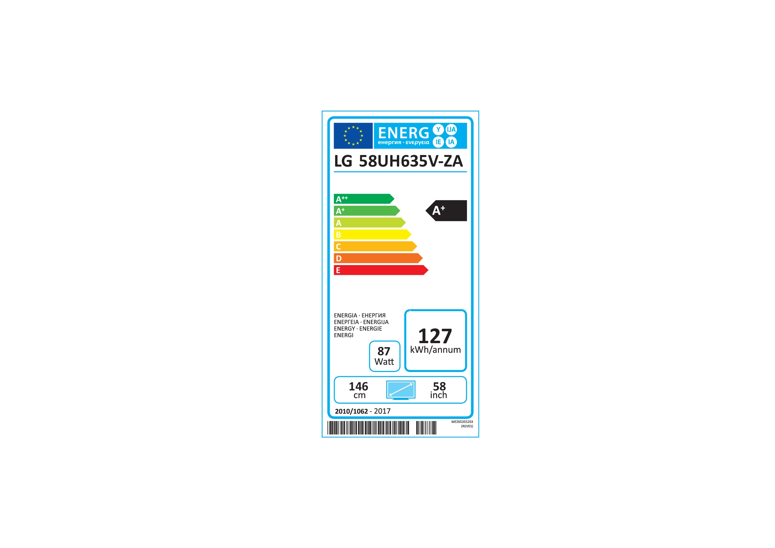LG 58UH635V. Diagonal de la pantalla: 147,3 cm (58"), Tipo HD: 4K Ultra HD, Resoluci¢n de la pantalla: 3840 x 2160 Pixeles. Formato de se¤al digital: DVB-C, DVB-S2, DVB-T2. Sistema operativo instalado: Web OS, Versi¢n de sistema operativo: 3.0. Modos de sonido: Juego, M£sica, Deportes, Est ndar, Tecnolog¡as de decodificaci¢n de audio: DTS-HD. Versi¢n Common interface Plus (CI+): 1.3