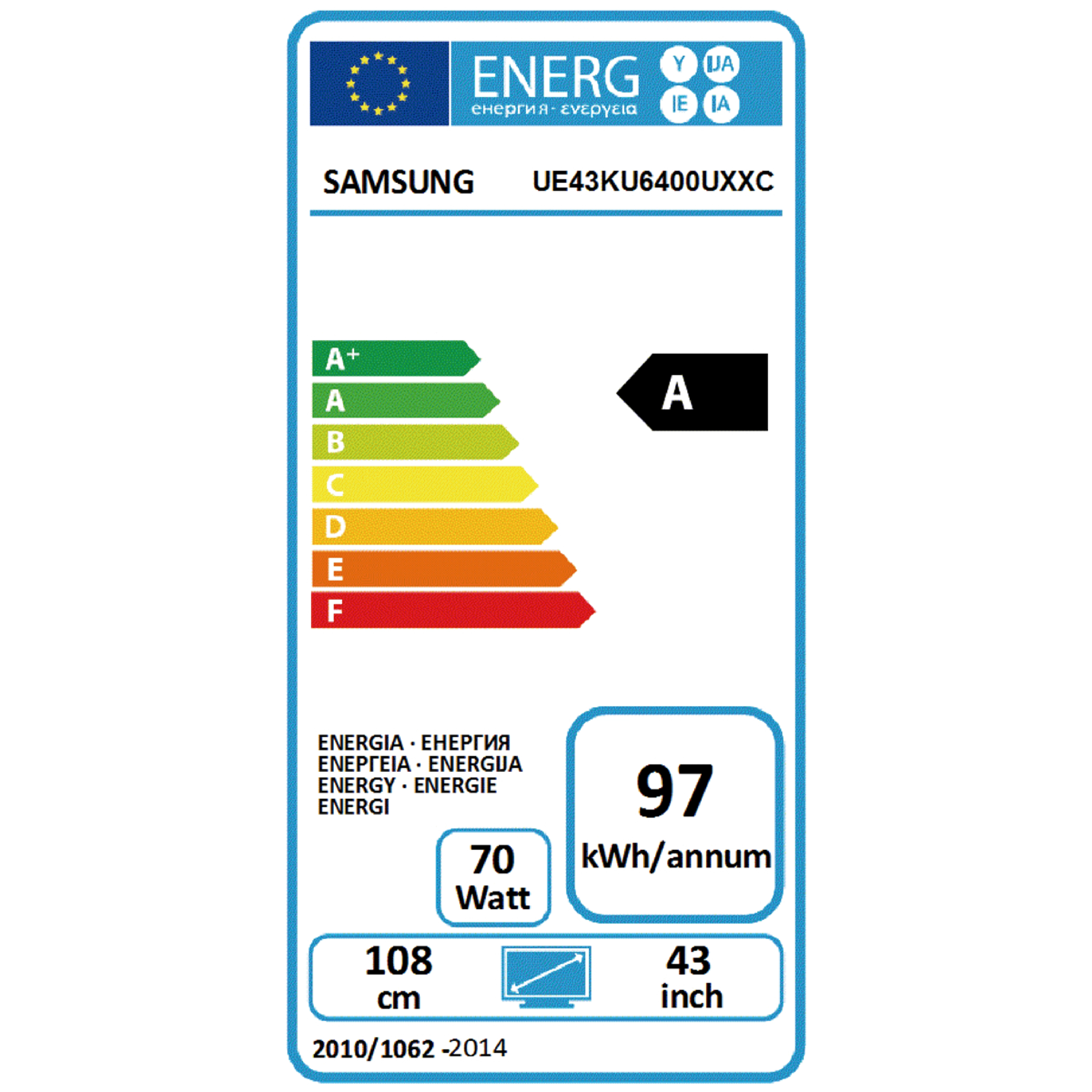 Samsung UE43KU6400U. Diagonal de la pantalla: 109,2 cm (43"), Tipo HD: 4K Ultra HD, Resolución de la pantalla: 3840 x 2160 Pixeles. Tipo de sintonizador: Analog & Digital, Formato de señal digital: DVB-T2. Sistema operativo instalado: Tizen. Potencia estimada RMS: 20 W, Decodificadores incorporados: DTS, Dolby Digital, Tecnologías de decodificación de audio: Dolby Digital Plus. Versión Common interface Plus (CI+): 1.3, Control de electrónica de consumo (CEC): Anynet+